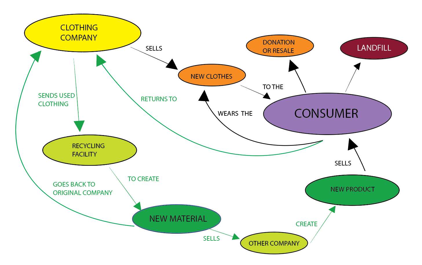 Spring 2025. System map representing the cycle of clothing manufacturers and consumers.