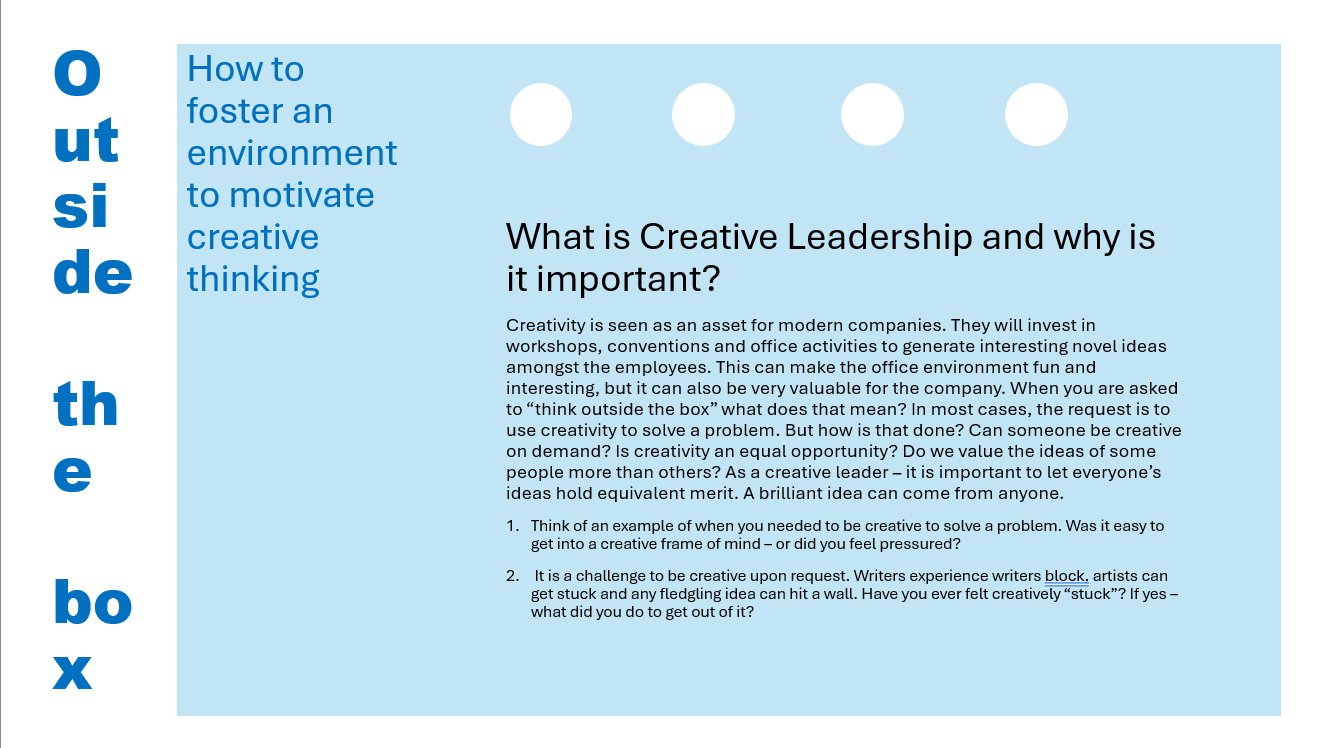 Fall 2024. Creative Leadership. How to Foster an Environment to Motivate Creative Thinking.