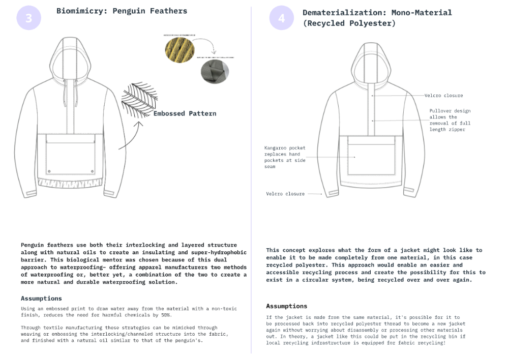These represent two ideas of mine that were part of our group’s final presentation. We were tasked with developing sustainable solutions for a rain jacket for our client, Under Armour. These concepts use biomimicry and dematerialization to create alternative versions of the jacket.